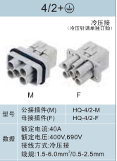 产品名称:HQ-4/2-M ·工作电流 : 40A/10A ·工作电压 : 400V/250V ·额定脉冲耐受电压 : 4KV ·绝缘电阻 : 10⁴MΩ ·工作温度 : -40℃--+125℃ ·阻燃等级 : V0(UL94)